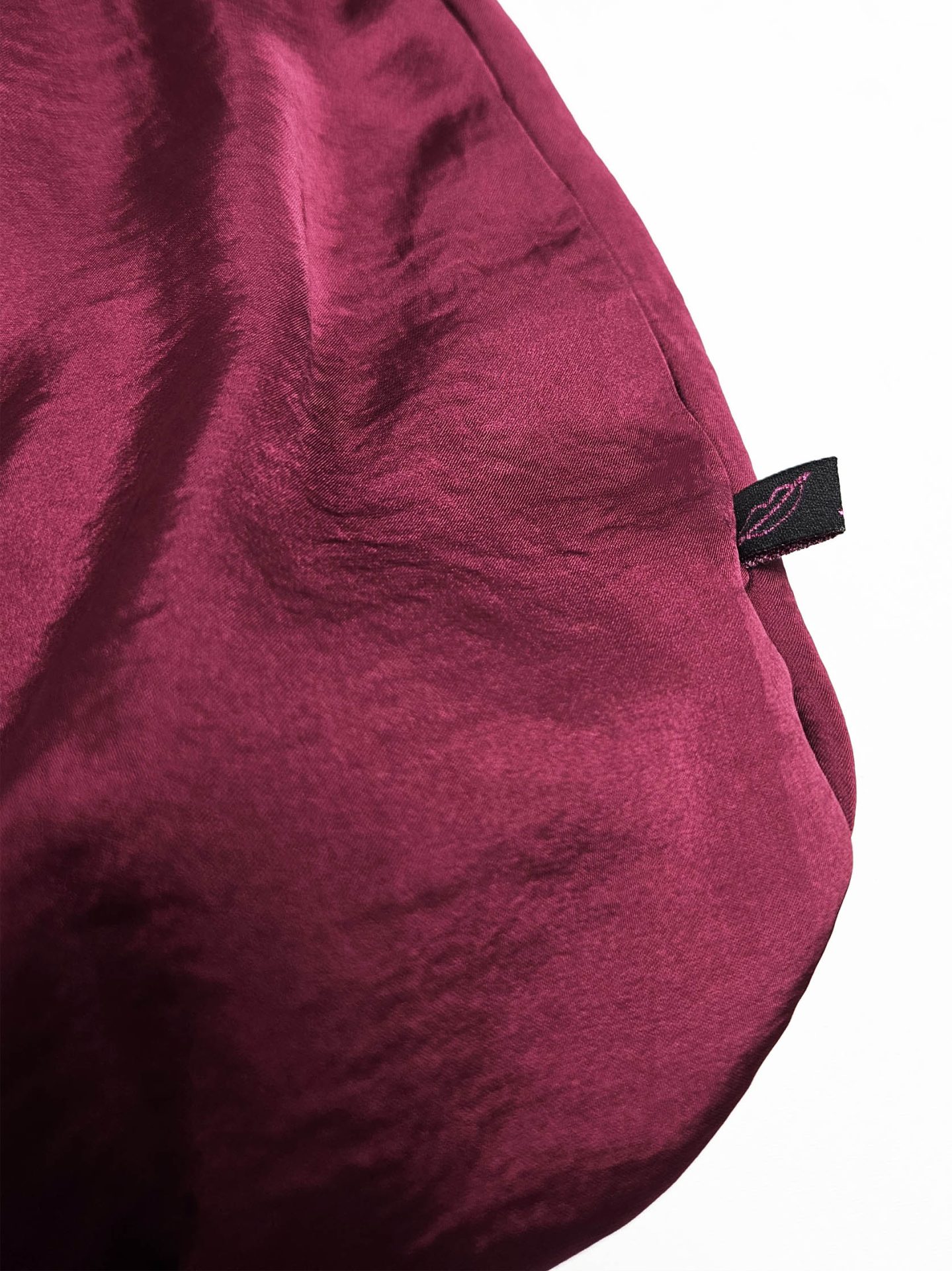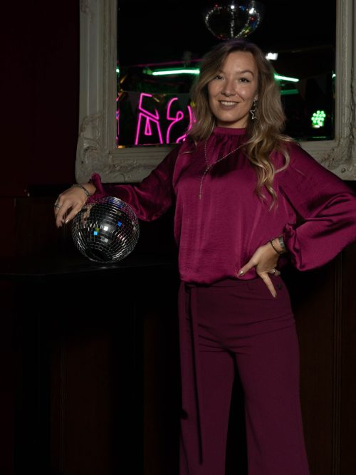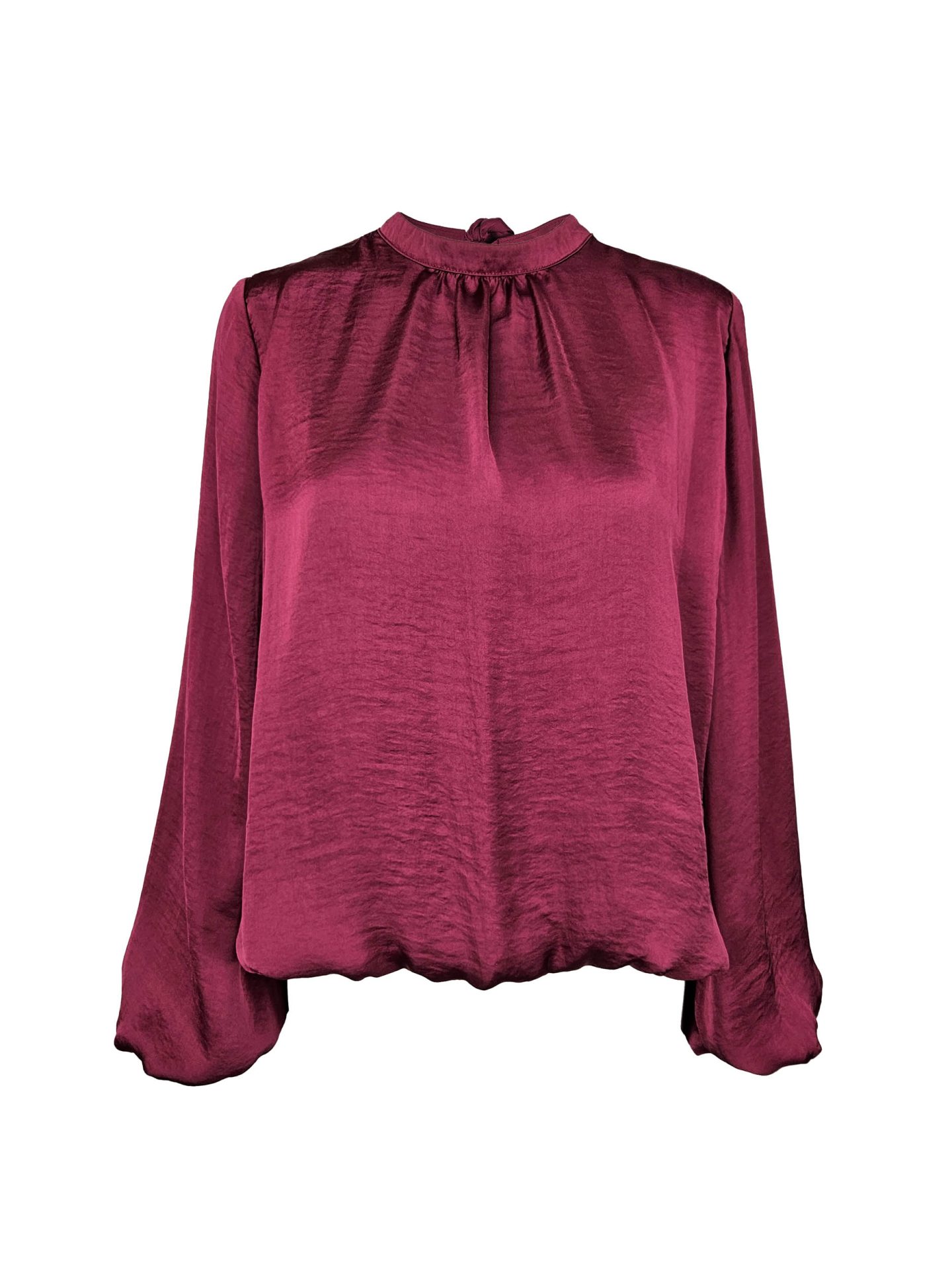 Let’s sparkle! De Fay blouse is een mooie satijnen blouse met ballon effect aan de onderzijde en plooitjes in de hals. In de nek sluit de blouse met een mooi strik detail. Doordat er plooien in de blouse zitten, komt de glans van de satijnen buiten stof extra naar voren. Aan de onderzijde zit elastiek, waardoor je de blouse over een broek kunt dragen, maar ook omhoog kunt halen voor een “cropped” effect. Deze blouse heeft een mooie, wijn / bordeaux rode kleur. Al onze items worden met liefde in Europa gemaakt! De satijnen buitenstof is 100% Polyester en de top is gevoerd met een Viscose/Elastaan (natuurlijk materiaal) voor extra draagcomfort. Ga jij stralen in onze Fay blouse?