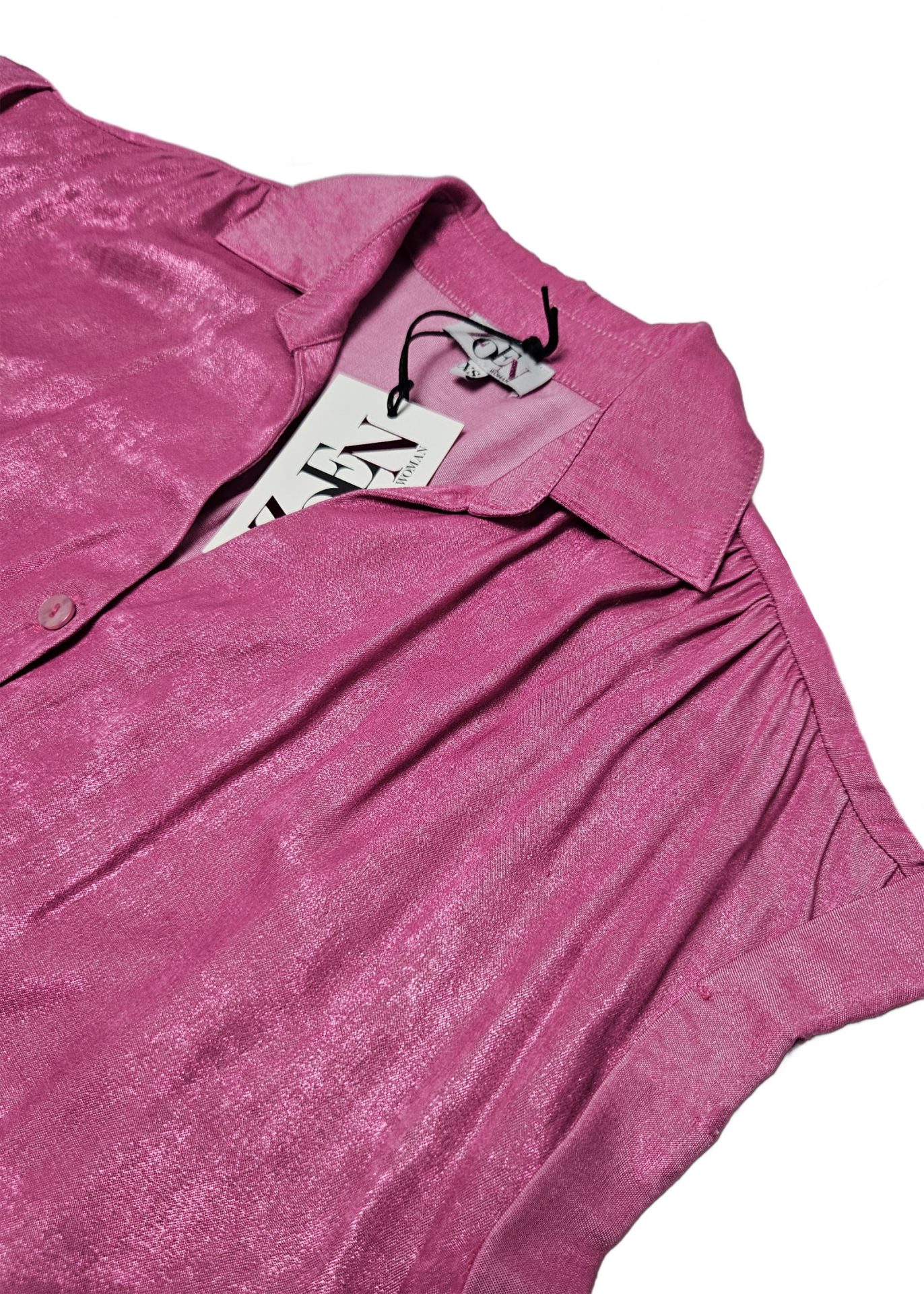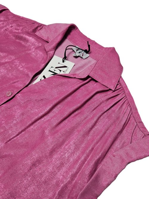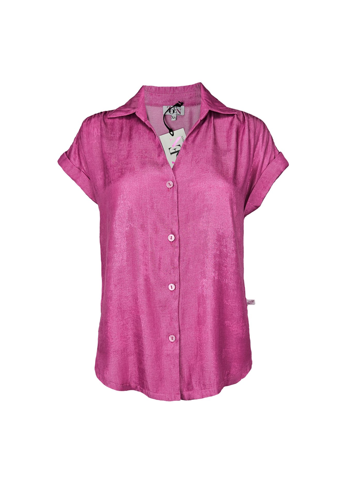 Voeg kleur toe aan jouw garderobe met onze Ginny blouse in shiny roze! Deze mooie ruimvallende blouse in een fuchsia roze kleur draagt heerlijk en fleurt iedere outfit op. Aan de voorzijde heeft de Ginny blouse een knoopsluiting met Zoen Woman brandbuttons en in de achterkant zit een mooie, geplooide naad. De stof valt lekker luchtig en soepel. Het is een fijne viscose-mix met mooie shimmer, 40% Viscose (natuurlijk materiaal) & 60% Polyester. Al onze items zijn met liefde gemaakt in Europa. Ga jij stralen in deze top?